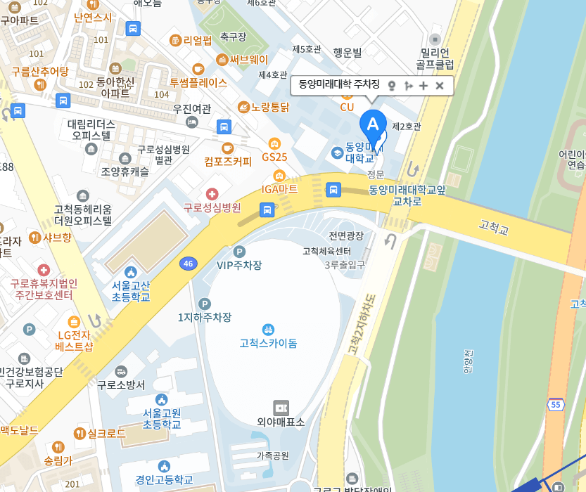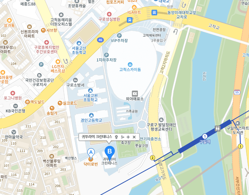 고척 스카이돔까지 도보 3분 거리로 매우 가까이 위치하고 있습니다. 주차요금은 30분당 2,000원이고 초과 시 10분마다 500원의 요금이 부과되며, 1일 최대 10,000원의 요금이 부과됩니다. 다만 주차면수는 약 120면으로 복잡한 편이며, 건물 3층의 닥터로빈 카페에서 3만원 이상 구매 시 2시간 무료의 혜택이 있습니다.